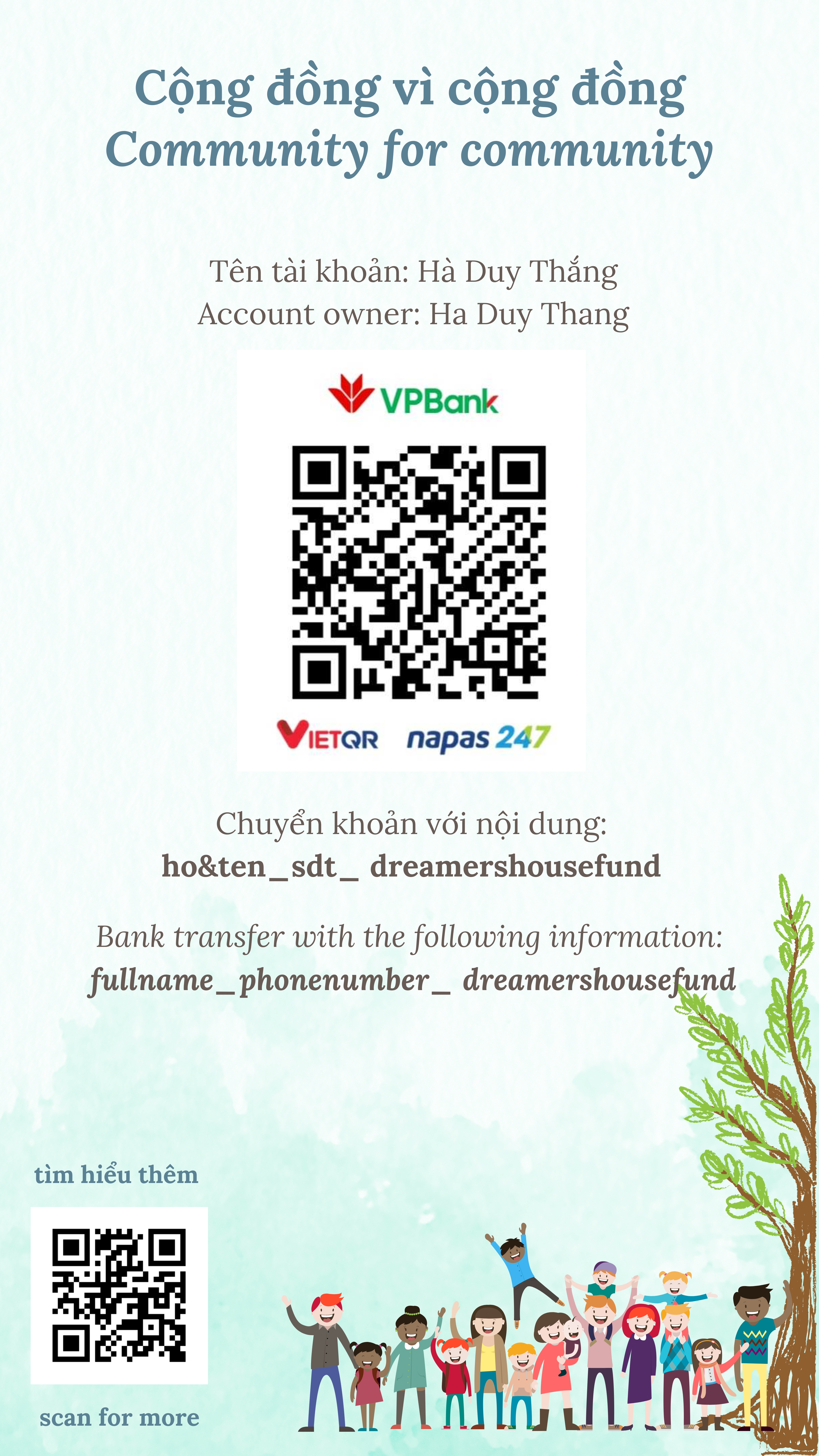 Dreamy wanderers can support our funds by bank transactions to our bank account. All your donations, dreamers.house will note down carefully. With every spending on your donation, we will clearly state them out; therefore, rest assured your love is in good hands. Twice a year, we will donate this fund to partners, communities, pagodas, and churches to support them in raising children with special backgrounds.
