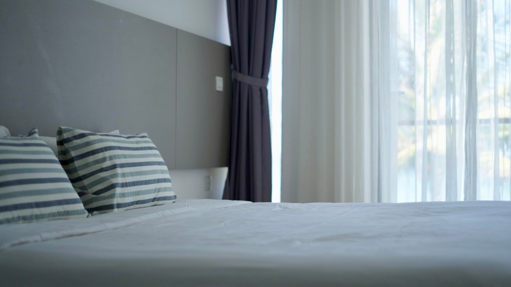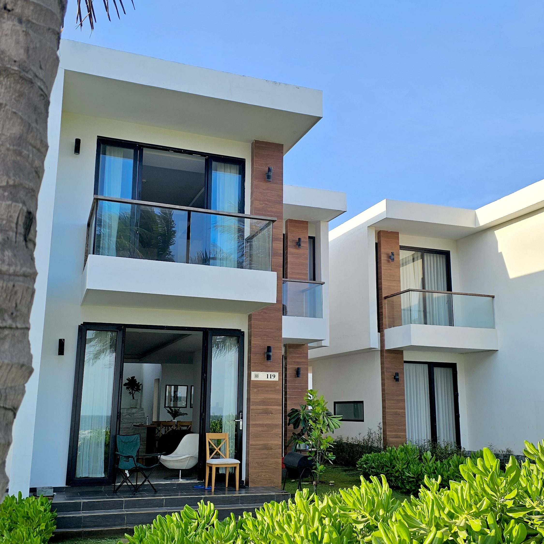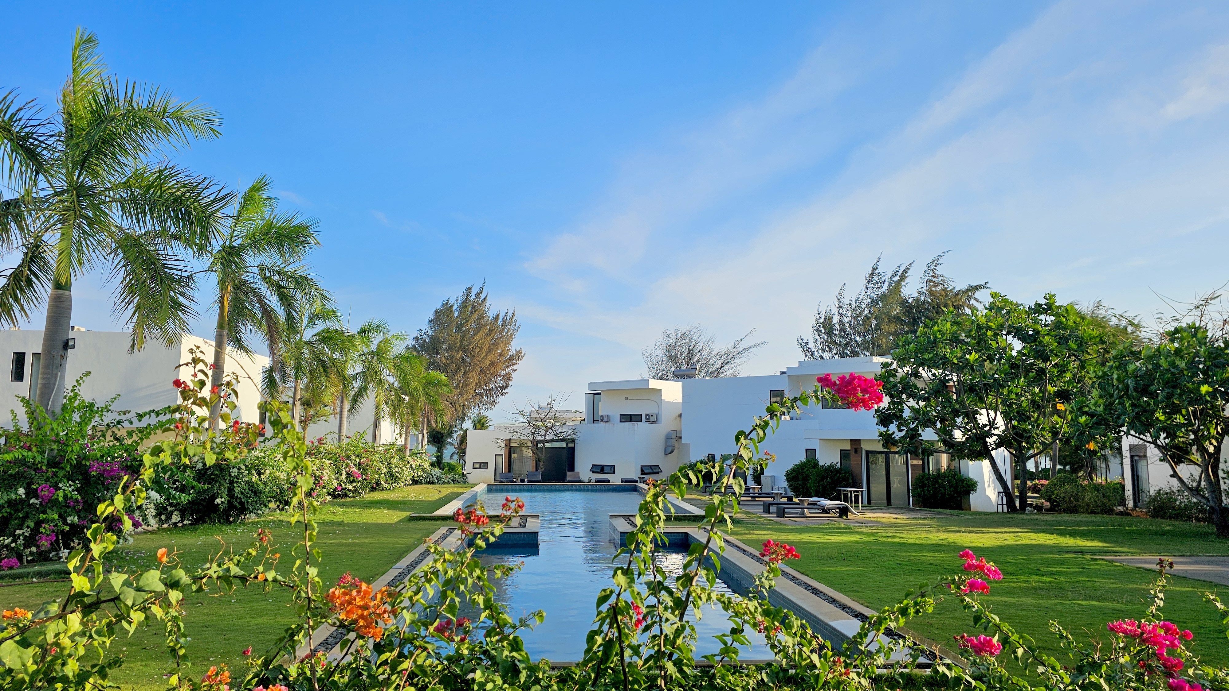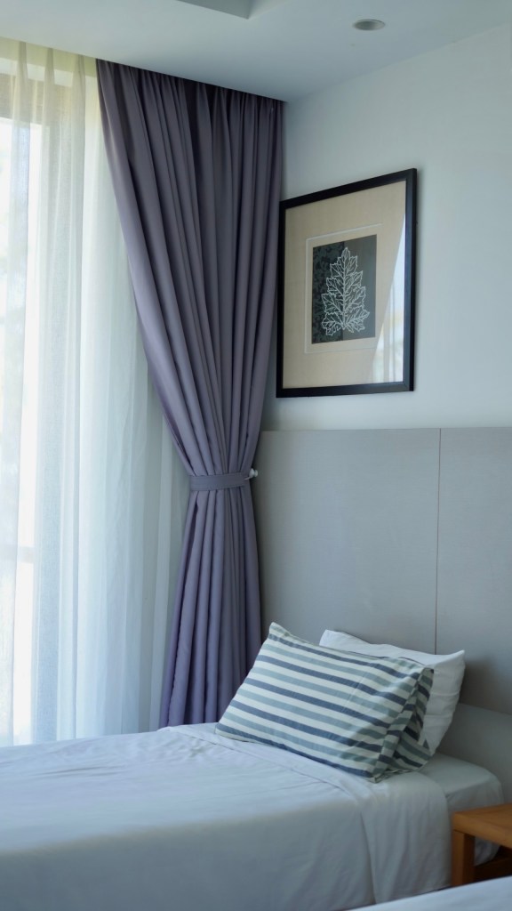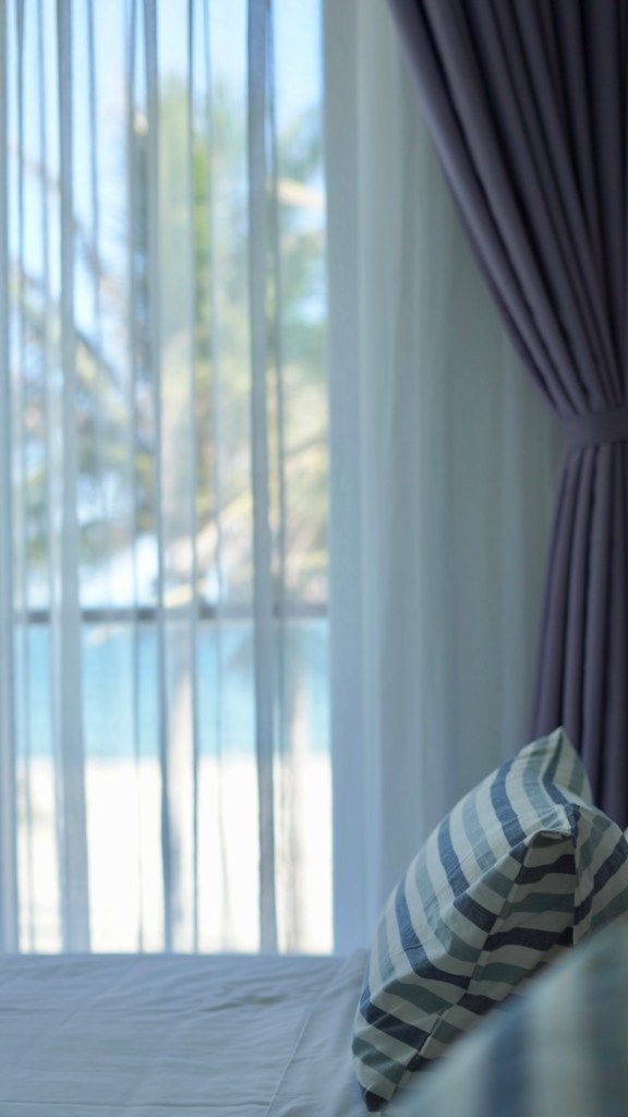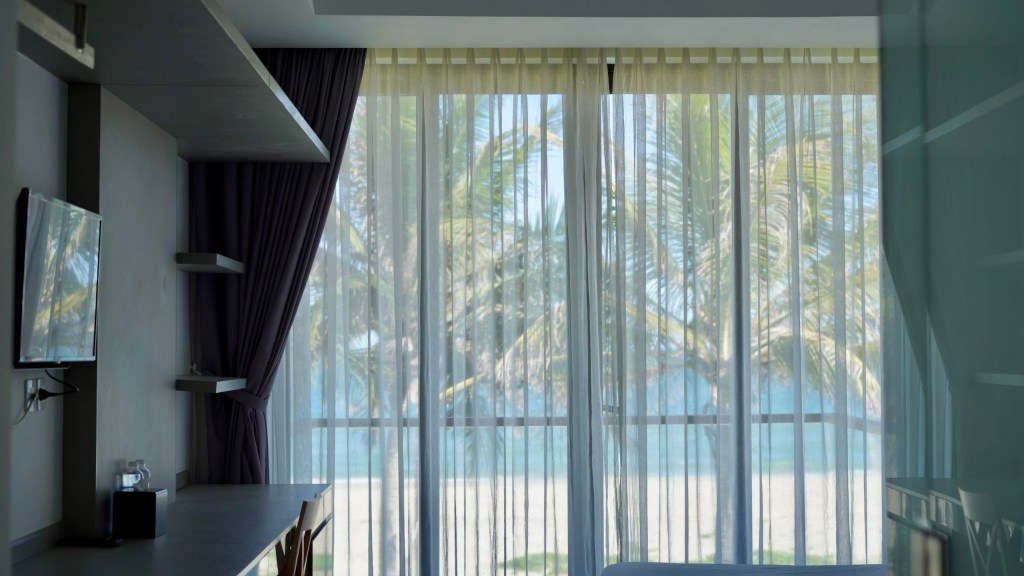 dù ngủ phòng nào, chỉ cần mở mắt kéo rèm, là biển đã ở trước mặt. chỉ là một phòng sẽ có bồn tắm, phòng còn lại thì không. bạn có thể ké, vì vừa ngâm bồn, vừa quay sang phải dòm biển, cũng hay ho lắm